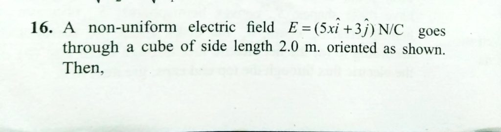 A non – uniform electric field E = ( 5 xi + 3 j ) N/C goes through a cube of side length 2 m . oriented as shown . then , A non - uniform electric field E = ( 5 xi + 3 j ) N/C goes through a cube of side length 2 m . oriented as shown . then November 1, 2020 Category: Uncategorised (JEE Advanced Physics by BM Sharma + GMP Solutions) , Facebook Messenger WhatsApp Share this:TwitterFacebook Related
