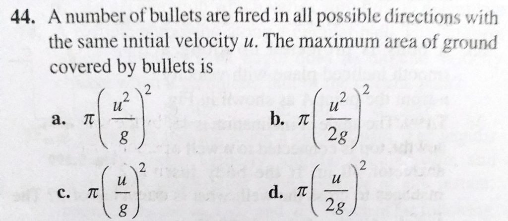 A number of bullets are fired in all possible directions with the same initial velocity u. The maximum area of ground covered by bullets is A number of bullets are fired in all possible directions with the same initial velocity u. The maximum area of ground covered by bullets is September 22, 2020 Category: Uncategorised (JEE Advanced Physics by BM Sharma + GMP Solutions) , Facebook Messenger WhatsApp Share this:TwitterFacebook Related