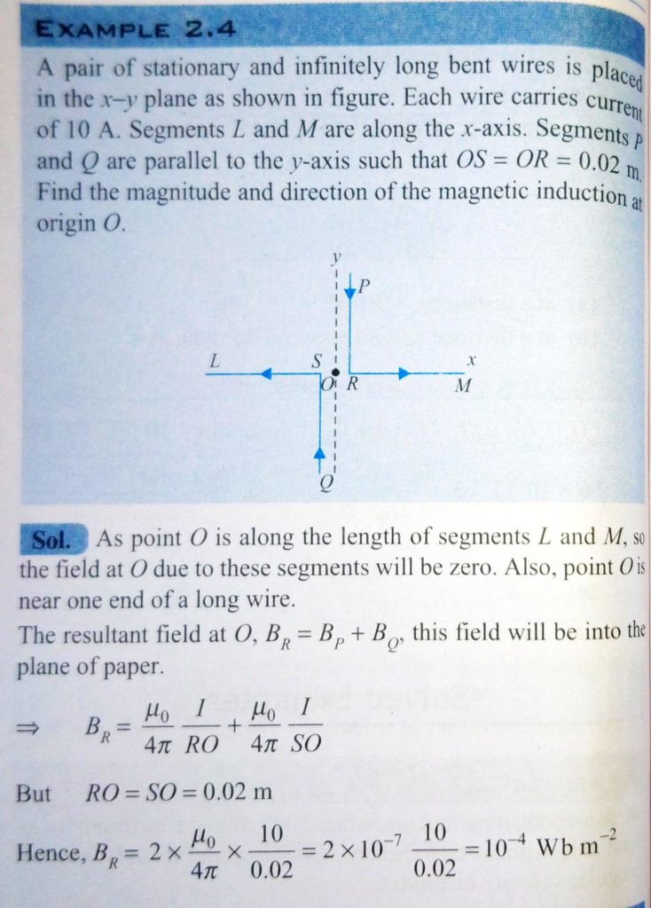 A pair of stationary and infinitely long bent wires are placed in the XY planes as shown in fig. The wires carry currents of I=10 amperes each as shown . The segments P and Q are parallel to the Y−axis such that OS=OR=0.02m. Find the magnitude and direction of the magnetic induction at the origin O.