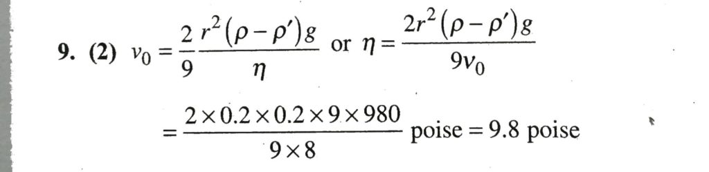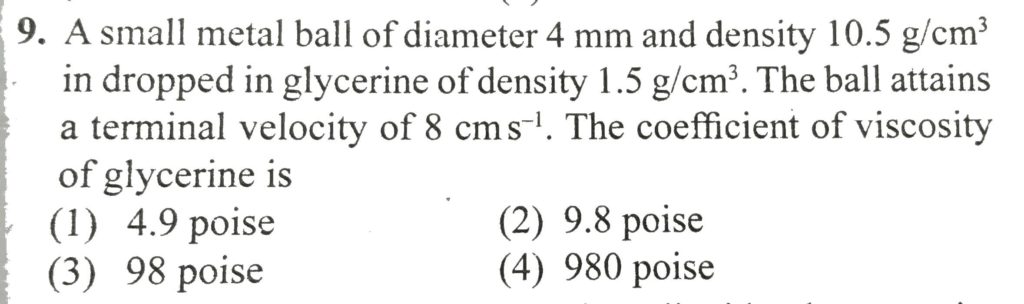 A small metal ball of diameter 4 mm and density 10.5 g/cm^3 in dropped in glycerine of density 1.5g/cm3. The ball attains a terminal velocity of 8 cm/s. The coefficient of viscosity of glycerine is A small metal ball of diameter 4 mm and density 10.5 g/cm^3 in dropped in glycerine of density 1.5g/cm3. The ball attains a terminal velocity of 8 cm/s. The coefficient of viscosity of glycerine is October 11, 2020 Category: Uncategorised (JEE Advanced Physics by BM Sharma + GMP Solutions) , Facebook Messenger WhatsApp Share this:TwitterFacebook Related
