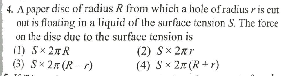 A paper disc of radius R from which a hole of radius r is cut out is floating in a liquid of the surface tension S. The force on the disc due to the surface tension is A paper disc of radius R from which a hole of radius r is cut out is floating in a liquid of the surface tension S. The force on the disc due to the surface tension is October 11, 2020 Category: Uncategorised (JEE Advanced Physics by BM Sharma + GMP Solutions) , Facebook Messenger WhatsApp Share this:TwitterFacebook Related