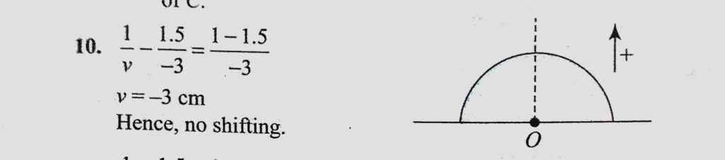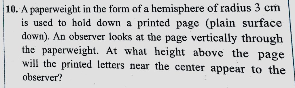A paperweight in the form of a hemisphere of radius 3 cm is used to hold down a printed page (plain surface down). An observer looks at the page vertically through the paperweight. A paperweight in the form of a hemisphere of radius 3 cm is used to hold down a printed page (plain surface down). An observer looks at the page vertically through the paperweight. October 7, 2020 Category: Uncategorised (JEE Advanced Physics by BM Sharma + GMP Solutions) , Facebook Messenger WhatsApp Share this:TwitterFacebook Related