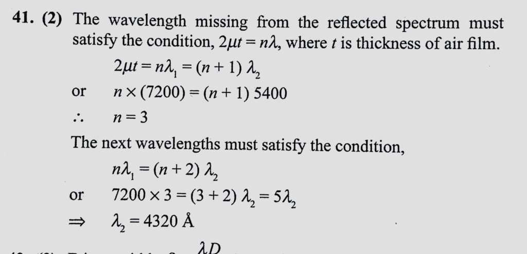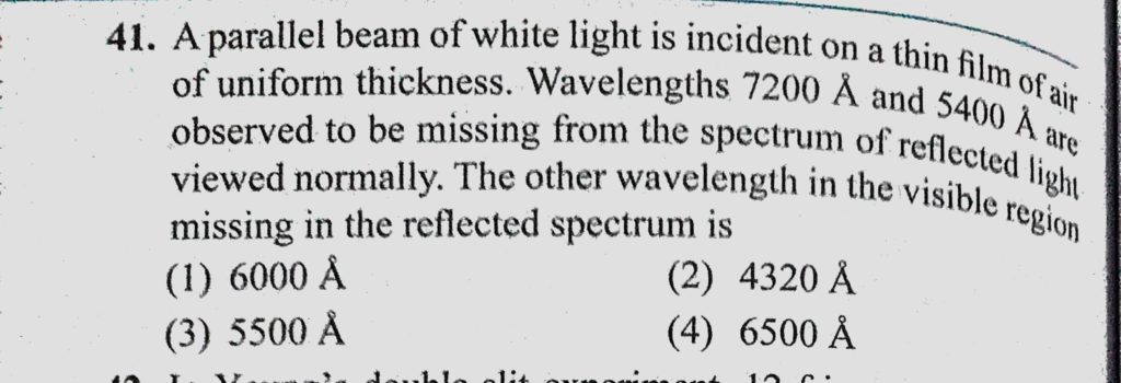 A parallel beam of white light is incident on a thin film of air of uniform thickness. Wavelengths 7200 A and 5400 A are observed to be missing from the spectrum of reflected light viewed A parallel beam of white light is incident on a thin film of air of uniform thickness. Wavelengths 7200 A and 5400 A are observed to be missing from the spectrum of reflected light viewed October 10, 2020 Category: Uncategorised (JEE Advanced Physics by BM Sharma + GMP Solutions) , Facebook Messenger WhatsApp Share this:TwitterFacebook Related