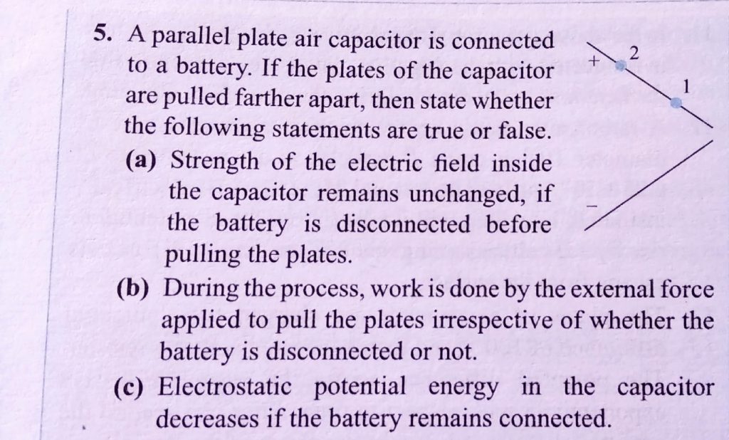 A parallel plate air capacitor is connected to a battery. If the plates of the capacitor are pulled farther apart, then state whether the following statements are true or false. a. Strength of the electric field inside the capacitor remains unchanged, if the battery is disconnected before pulling the plates. b. During the process, work is done by the external force applied to pull the plates irrespective of whether the battery is disconnected or not. c. Strain energy in the capacitor decreases if the battery remains connected.