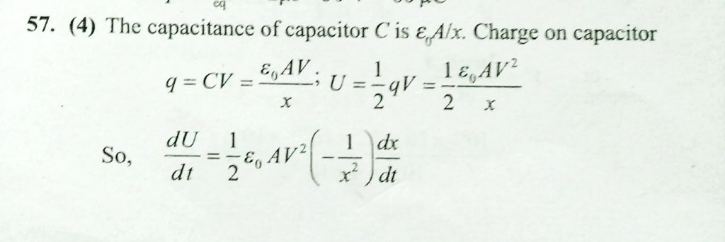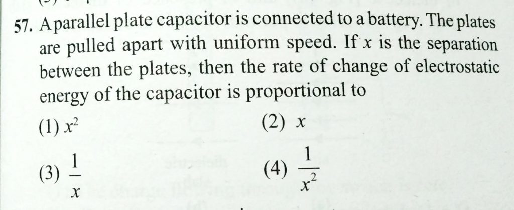 A parallel plate capacitor is connected to a battery. The plates are pulled apart with uniform speed. If x is the separation between the plates, then the rate of change of electrostatic energy of the capacitor is proportional to A parallel plate capacitor is connected to a battery. The plates are pulled apart with uniform speed. If x is the separation between the plates then the rate of change of electrostatic energy of the capacitor is proportional to November 8, 2020 Category: Uncategorised (JEE Advanced Physics by BM Sharma + GMP Solutions) , Facebook Messenger WhatsApp Share this:TwitterFacebook Related