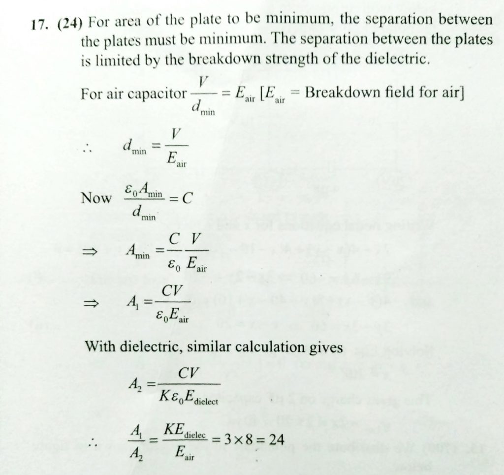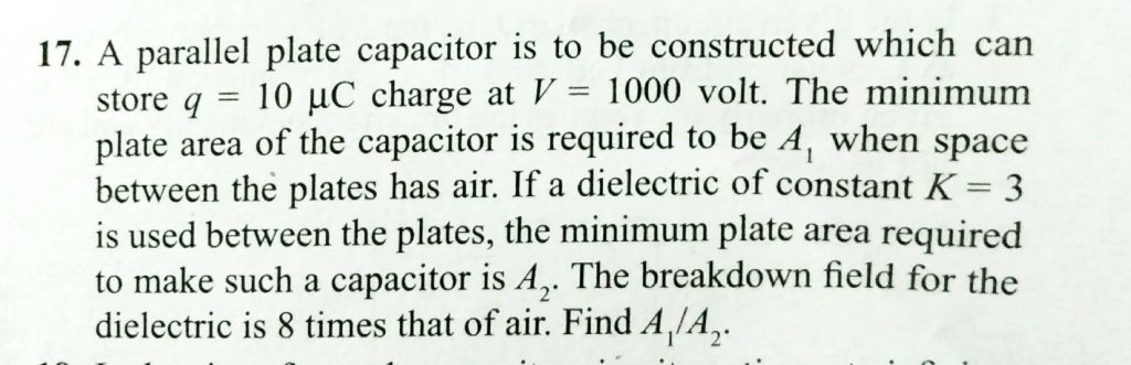 A parallel plate capacitor is to be constructed which can store q = 10 μC charge at V= 1000 volt. The minimum plate area of the capacitor is required to be A1 when space between the plates has air. If a dielectric of constant K=3 is used between the plates, the minimum plate area required to make such a capacitor is A2. The breakdown field for the dielectric is 8 times that of air. Find A1/A2