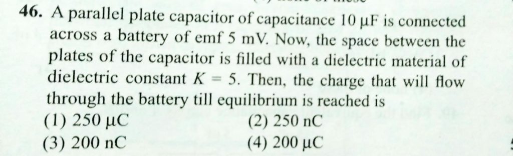 A parallel plate capacitor of capacitance 10μF is connected across a battery of emf 5 mV. Now, the space between the plates of the capacitors is filled with a deielectric material of dielectric constant K=5. Then, the charge that will flow through the battery till equilibrium is reached is