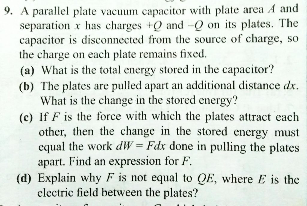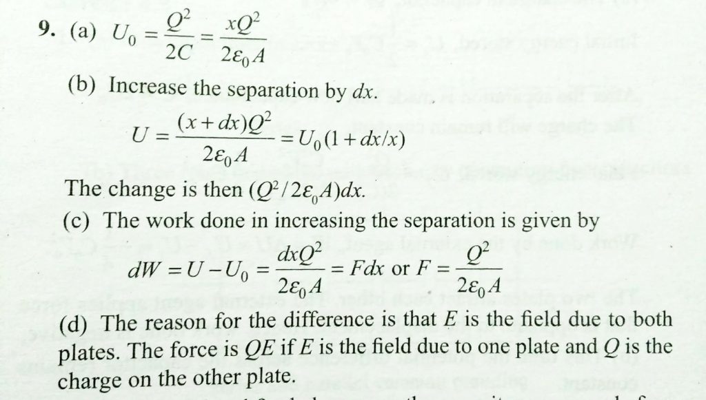 A parallel plate vaccum capacitor with plate area A and separation x has charges +Q and -Q on its plates. The capacitor is dissconnected from the source of charge, so the charge on each plate remains fixed. A parallel plate vaccum capacitor with plate area A and separation x has charges +Q and -Q on its plates. The capacitor is dissconnected from the source of charge so the charge on each plate remains fixed. November 7, 2020 Category: Uncategorised (JEE Advanced Physics by BM Sharma + GMP Solutions) , Facebook Messenger WhatsApp Share this:TwitterFacebook Related