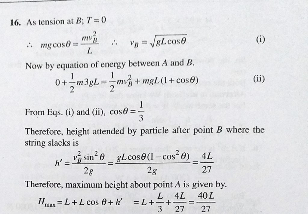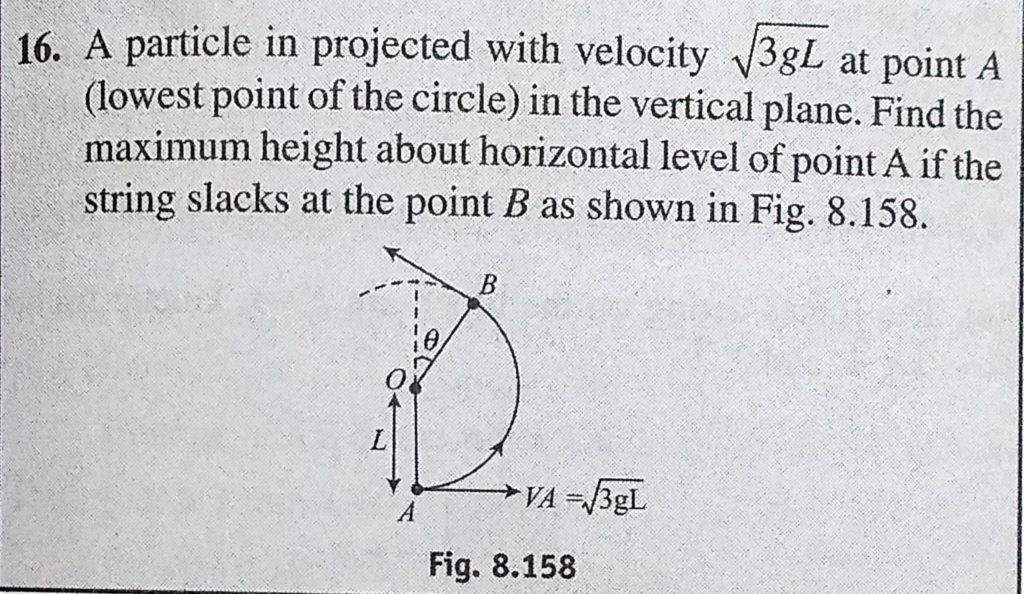 A particle in projected with velocity root 3 gL at point A (lowest point of the circle ) in the verticle plane. Find the maximum height about horizontal level of point A if the string slacks A particle in projected with velocity root 3 gL at point A (lowest point of the circle ) in the verticle plane. Find the maximum height about horizontal level of point A if the string slacks October 3, 2020 Category: Uncategorised (JEE Advanced Physics by BM Sharma + GMP Solutions) , Facebook Messenger WhatsApp Share this:TwitterFacebook Related