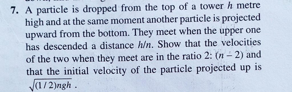 A particle is dropped from the top of a tower h metre high and at the same moment another particle is projected upward from the bottom. They meet when the upper one has descended a distance h/n. Show that the a second stone is dropped. Prove that the distance between the stones after time t A stone is let to fall from a balloon ascending with an acceleration f. After time t since the second stone is dropped September 18, 2020 Category: Uncategorised (JEE Advanced Physics by BM Sharma + GMP Solutions) , Facebook Messenger WhatsApp Share this:TwitterFacebook Related