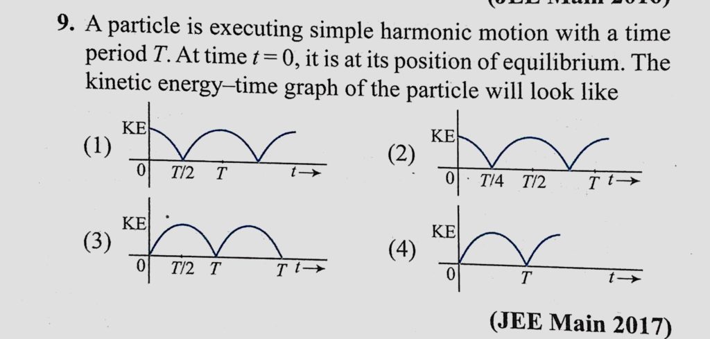 A particle is executing simple harmonic motion with a time period T. At time t = 0, it is at its position of equilibrium. The kinetic energy-time graph of the particle will look like A particle is executing simple harmonic motion with a time period T. At time t = 0 it is at its position of equilibrium. The kinetic energy-time graph of the particle will look like November 1, 2020 Category: Uncategorised (JEE Advanced Physics by BM Sharma + GMP Solutions) , Facebook Messenger WhatsApp Share this:TwitterFacebook Related