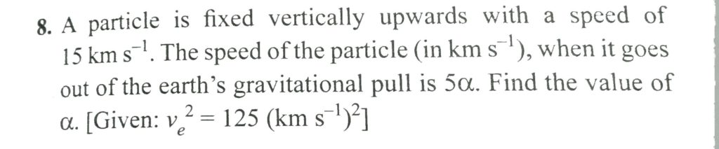 A particle is fixed vertically upwards with a speed of 15 km/s . The speed of the particle ( in km/s ), when it goes out of the earth’s gravitational pull is 5 alpha. Find the value of alpha. A particle is fixed vertically upwards with a speed of 15 km/s . The speed of the particle ( in km/s ) when it goes out of the earth's gravitational pull is 5 alpha. Find the value of alpha. October 6, 2020 Category: Uncategorised (JEE Advanced Physics by BM Sharma + GMP Solutions) , Facebook Messenger WhatsApp Share this:TwitterFacebook Related