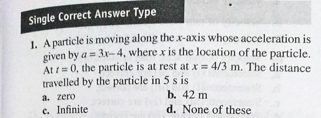 A particle is moving along the x-axis whose acceleration is given by a = 3x -4, where x is the location of the particle. At t = 0, the particle is at rest at x = 4/3 m. The distance travelled by the A particle is moving along the x-axis whose acceleration is given by a = 3x -4 the particle is at rest at x = 4/3 m. The distance travelled by the where x is the location of the particle. At t = 0 September 24, 2020 Category: Uncategorised (JEE Advanced Physics by BM Sharma + GMP Solutions) , Facebook Messenger WhatsApp Share this:TwitterFacebook Related