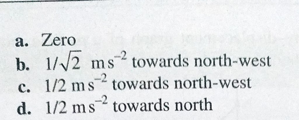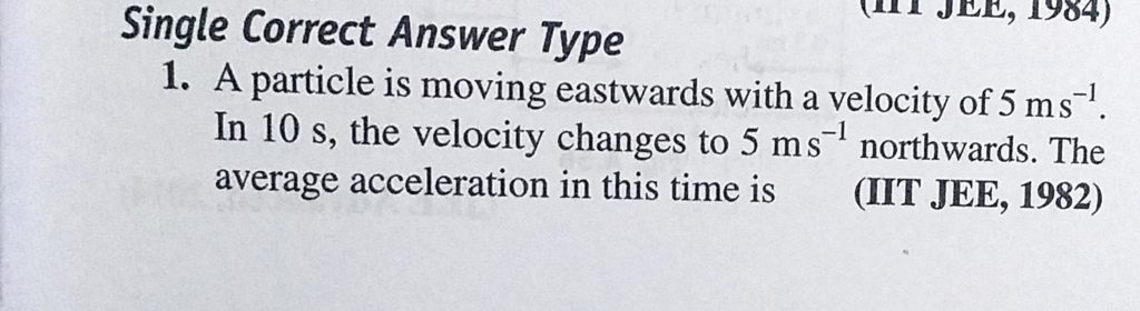 A particle is moving eastwards with a velocity of 5 m/s. In 10 s, the velocity changes to 5 m/s northwards. The average acceleration in this time is A particle is moving eastwards with a velocity of 5 m/s. In 10 s the velocity changes to 5 m/s northwards. The average acceleration in this time is September 25, 2020 Category: Uncategorised (JEE Advanced Physics by BM Sharma + GMP Solutions) , Facebook Messenger WhatsApp Share this:TwitterFacebook Related