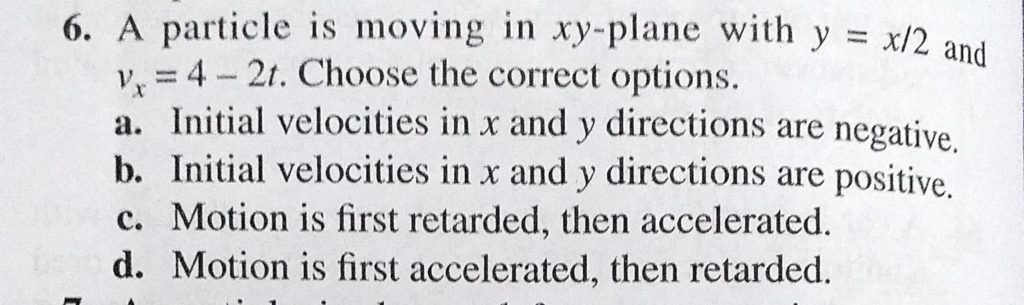 A particle is moving in xy plane with y = x/2 and vx = 4 – 2t. Choose the correct options. a. Initial velocities in x and y directions are negative. A particle is moving in xy plane with y = x/2 and vx = 4 - 2t. Choose the correct options. a. Initial velocities in x and y directions are negative. September 24, 2020 Category: Uncategorised (JEE Advanced Physics by BM Sharma + GMP Solutions) , Facebook Messenger WhatsApp Share this:TwitterFacebook Related