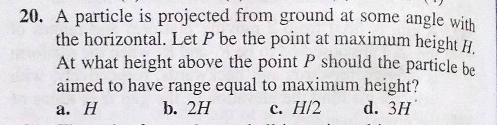 A particle is projected from ground at some angle with the horizontal . Let P be the point at maximum height H. At what height above the point P should the particle be aimed to have range A particle is projected from ground at some angle with the horizontal . Let P be the point at maximum height H. At what height above the point P should the particle be aimed to have range September 22, 2020 Category: Uncategorised (JEE Advanced Physics by BM Sharma + GMP Solutions) , Facebook Messenger WhatsApp Share this:TwitterFacebook Related