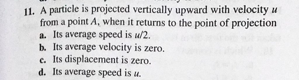 A particle is projected vertically upward with velocity u from a point A, when it returns to the poin of projection a. Its average speed is u/2. b. Its average velocity is zero. A particle is projected vertically upward with velocity u from a point A when it returns to the poin of projection a. Its average speed is u/2. b. Its average velocity is zero. September 19, 2020 Category: Uncategorised (JEE Advanced Physics by BM Sharma + GMP Solutions) , Facebook Messenger WhatsApp Share this:TwitterFacebook Related