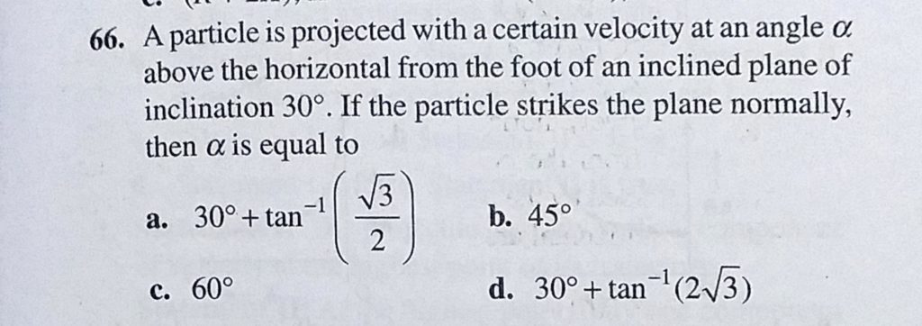 A particle is projected with a certain velocity at an angle alpha above the horizontal from the foot of an inclined plane of inclination 30. If the particle strikes the plane normally, then alpha is equal to A particle is projected with a certain velocity at an angle alpha above the horizontal from the foot of an inclined plane of inclination 30. If the particle strikes the plane normally then alpha is equal to September 24, 2020 Category: Uncategorised (JEE Advanced Physics by BM Sharma + GMP Solutions) , Facebook Messenger WhatsApp Share this:TwitterFacebook Related