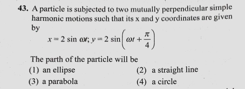 A particle is subjected to two mutually perpendicular simple harmonic motions such that its x and y coordinates are given by x = 2 sin omega t ; y = 2 sin (omega t + pie/4) The path of the particle will be Two particles move parallel to the x-axis about the origin with same amplitude 'a' and frequency omega. At a certain instant they are found at a distance a/3 from the origin on opposite October 31, 2020 Category: Uncategorised (JEE Advanced Physics by BM Sharma + GMP Solutions) , Facebook Messenger WhatsApp Share this:TwitterFacebook Related