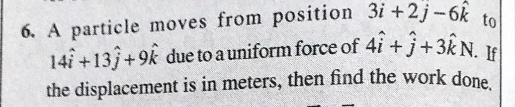 A particle moves from position 3i + 2j _ 6k to 14i + 13j + 9k due to a uniform force of 4i +j =3k N. If the displacement is in meters, then find the work done. A particle moves from position 3i + 2j _ 6k to 14i + 13j + 9k due to a uniform force of 4i +j =3k N. If the displacement is in meters then find the work done. September 16, 2020 Category: Uncategorised (JEE Advanced Physics by BM Sharma + GMP Solutions) , Facebook Messenger WhatsApp Share this:TwitterFacebook Related