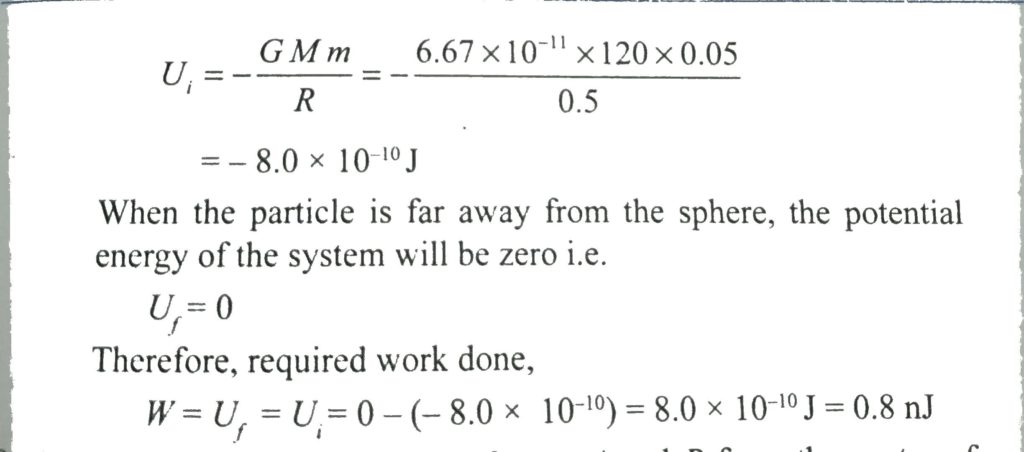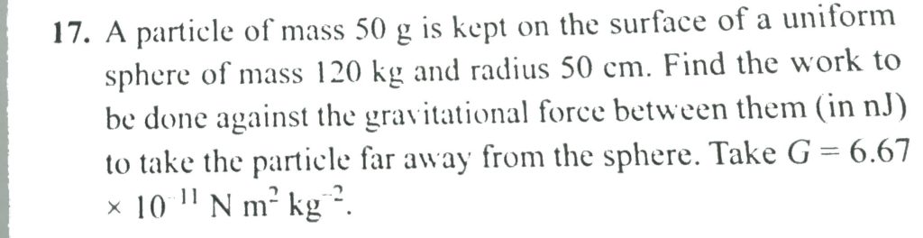 A particle of mass 10 g is kept on the surface of a uniform sphere of masss 100 kg and radius 10cm. Find the work to be done against the gravitational force between them to take the particel far away from the sphere (you may take G=6.67× 10^−11 N/m2 k g^2)