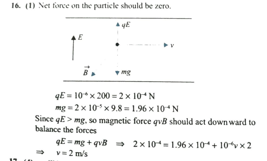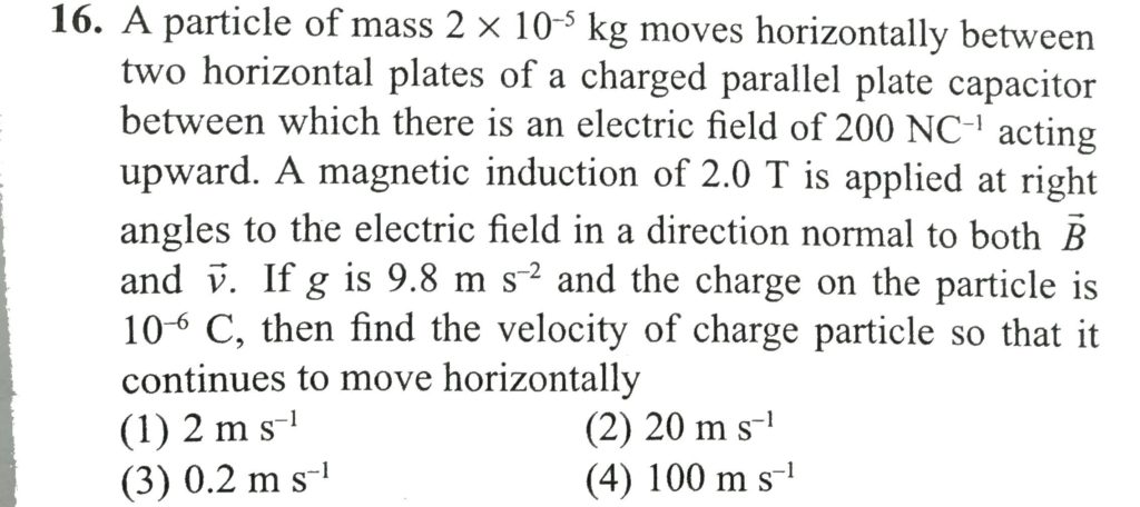 A particle of mass 2 × 10^−5 kg moves horizontally between two horizontal plates of a charged parallel plate capacitor between which there is an electric field of 200 N/C acting upward. A magnetic induction of 2.0 T is applied at right angles to the electric field in a direction normal to both B and v . If g is 9.8 m/s^2 and the charge on the particle is 10^−6 C, then find the velocity of charge particle so that it continues to move horizontally