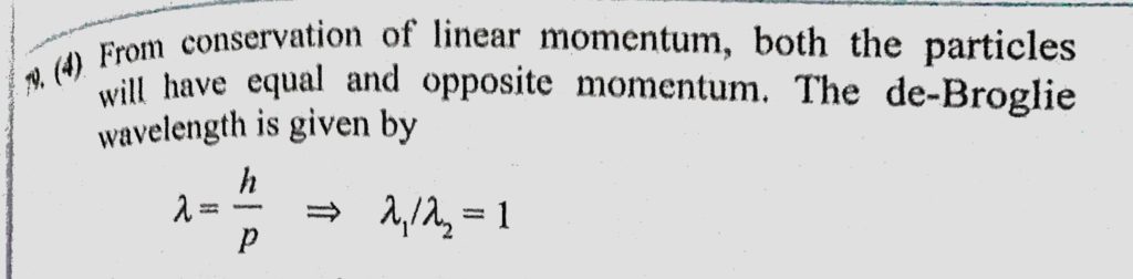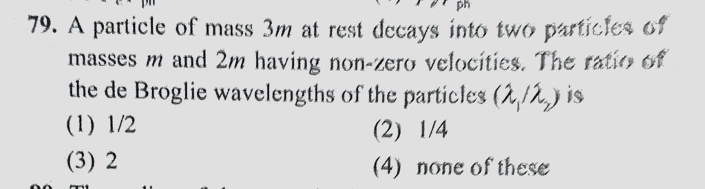 A particle of mass 3m at rest decays into two particles of masses m and 2m having non-zero velocities. The ratio of the de Broglie wavelengths of the particles (lemda 1 / lemda 2) is A particle of mass 3m at rest decays into two particles of masses m and 2m having non-zero velocities. The ratio of the de Broglie wavelengths of the particles (lemda 1 / lemda 2) is October 14, 2020 Category: Uncategorised (JEE Advanced Physics by BM Sharma + GMP Solutions) , Facebook Messenger WhatsApp Share this:TwitterFacebook Related