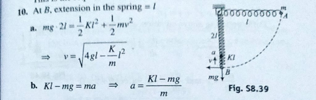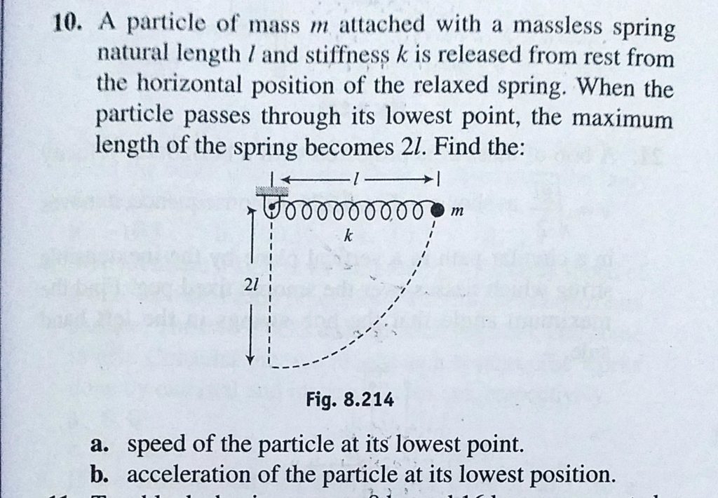 A particle of mass m attached with a massless spring natural length l and stiffness k is released from rest from the horizontal position of the relaxed spring. When the particle passes through its A particle of mass m attached with a massless spring natural length l and stiffness k is released from rest from the horizontal position of the relaxed spring. When the particle passes through its October 3, 2020 Category: Uncategorised (JEE Advanced Physics by BM Sharma + GMP Solutions) , Facebook Messenger WhatsApp Share this:TwitterFacebook Related