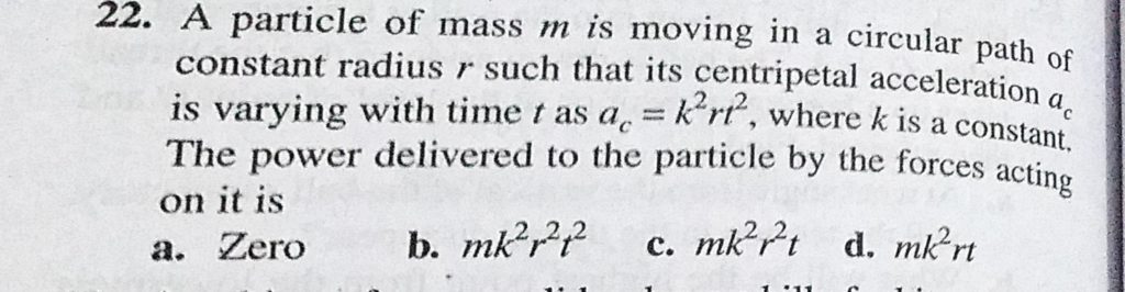 A particle of mass m is moving in a circular path of constant radius r such that its centripetal acceleration ac is varying with time t as ac = k^2rt^2, where k is a constant. The power delivered to the A particle of mass m is moving in a circular path of constant radius r such that its centripetal acceleration ac is varying with time t as ac = k^2rt^2 where k is a constant. The power delivered to the October 3, 2020 Category: Uncategorised (JEE Advanced Physics by BM Sharma + GMP Solutions) , Facebook Messenger WhatsApp Share this:TwitterFacebook Related