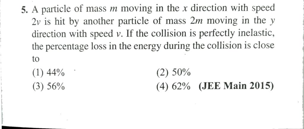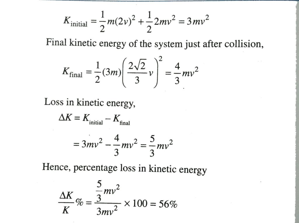 A particle of mass m moving in x-direction with speed 2v is hit by another particle of mass 2m moving in the y-direction with speed v. If the collisioni is perfectly inelastic, the percentage of the energy retained by the colliding particles after the collision is close to