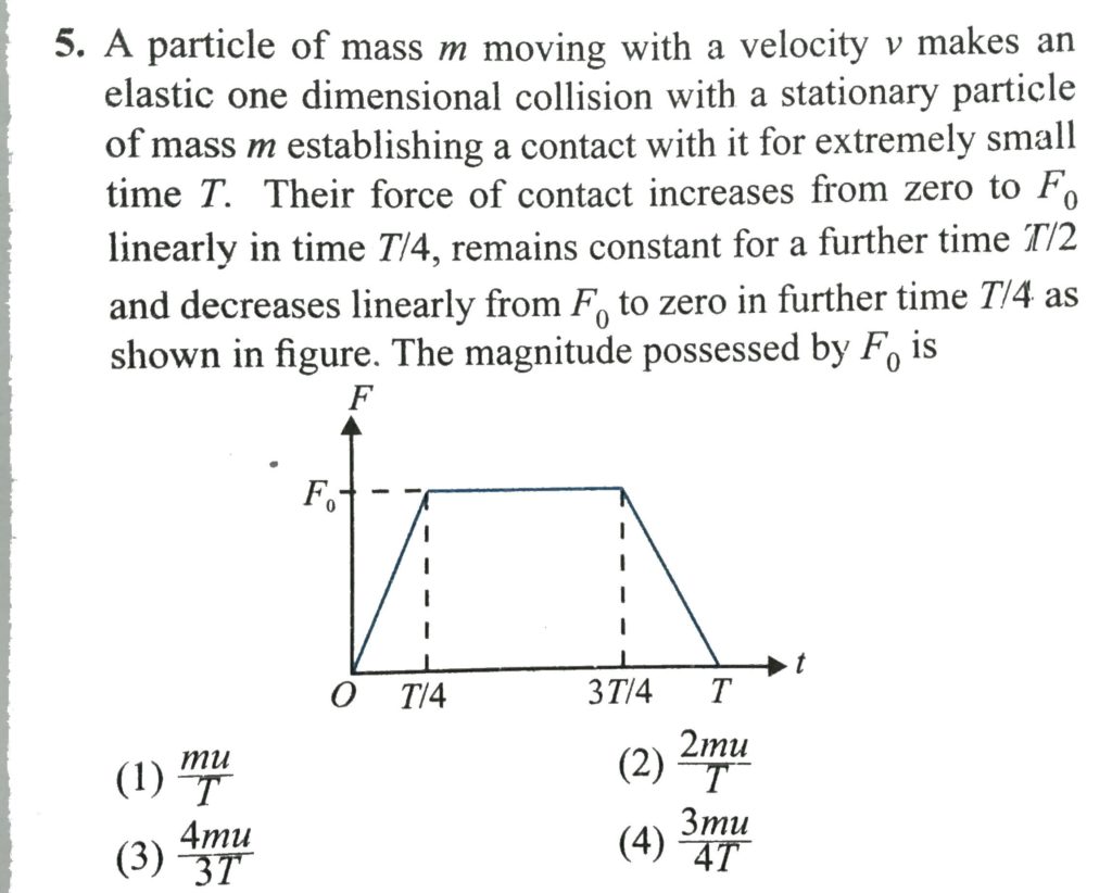 A particle of mass m moving with a velocity u makes an elastic one-dimensional collision with a stationary particle of mass m establishing a contact with it for extermely small time. T. Their force of contact increases from zero to F0 linearly in time T/4, remains constant for a further time T/2 and decreases linearly from F0 to zero in further time T/4 as shown. The magnitude possessed by F0 is.