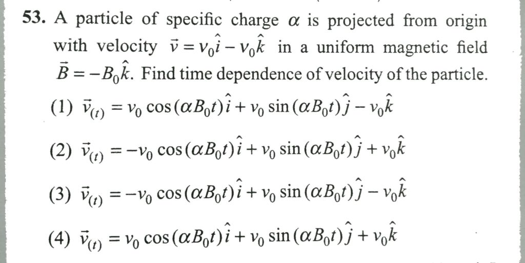 A particle of specific charge alpha is projected from origin with velocity v = v0i – v0k in a uniform magnetic field B = -B0K. Find tim,e dependence of velocity of the particle. A particle of specific charge alpha is projected from origin with velocity v = v0i - v0k in a uniform magnetic field B = -B0K. Find tim e dependence of velocity of the particle. October 14, 2020 Category: Uncategorised (JEE Advanced Physics by BM Sharma + GMP Solutions) , Facebook Messenger WhatsApp Share this:TwitterFacebook Related