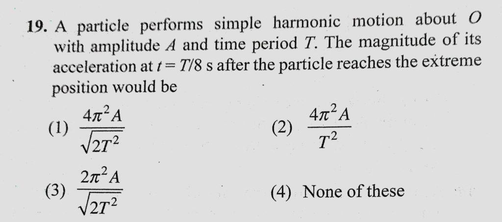 A particle performs simple harmonic motion about O with amplitude A and time period T. The magnitude of its acceleration at t = T/8 after the particle reaches the extreme position A particle performs simple harmonic motion about O with amplitude A and time period T. The magnitude of its acceleration at t = T/8 after the particle reaches the extreme position October 30, 2020 Category: Uncategorised (JEE Advanced Physics by BM Sharma + GMP Solutions) , Facebook Messenger WhatsApp Share this:TwitterFacebook Related