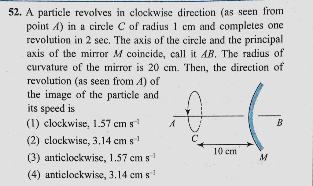 A particle revolves in clockwise direction (as seen from point A) in a circle C of radius 1 cm and completes one revolution in 2 sec. The axis of the circle and the principal axis of the mirror M coincide, A point object O is at the centre of curvature of a concave mirror. The mirror starts to move at a speed u in a direction perpendicular to the principal axis. Then the initial velocity October 6, 2020 Category: Uncategorised (JEE Advanced Physics by BM Sharma + GMP Solutions) , Facebook Messenger WhatsApp Share this:TwitterFacebook Related