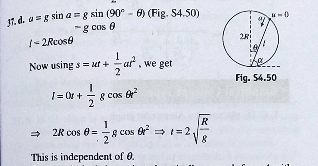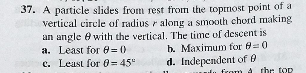 A particle slides from rest from the topmost point of a vertical circle of radius r along a smooth chord making an angle theta with the vertical. The time of descent is A particle slides from rest from the topmost point of a vertical circle of radius r along a smooth chord making an angle theta with the vertical. The time of descent is September 19, 2020 Category: Uncategorised (JEE Advanced Physics by BM Sharma + GMP Solutions) , Facebook Messenger WhatsApp Share this:TwitterFacebook Related