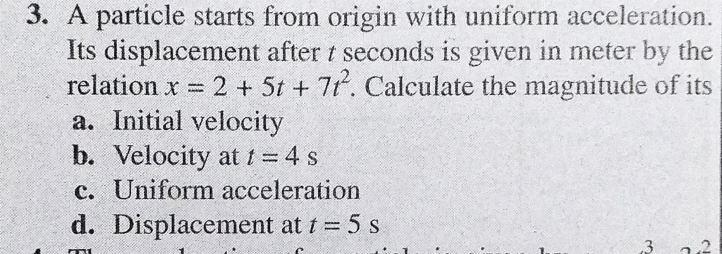 A particle starts from origin with uniform acceleration. Its displacement after t seconds is given in meter by the relation x = 2 + 5t + 7t^2. Calculate the magnitude of its a. Initial velocity b. Velocity at t = 4 s If a particle starts moving with initial velocity u = 1 m s^-1 and acceleration a = 2 m s^-2 the velocity of the particle at any time is given by v = u + at = 1 + 2t. Plot the velocity September 16, 2020 Category: Uncategorised (JEE Advanced Physics by BM Sharma + GMP Solutions) , Facebook Messenger WhatsApp Share this:TwitterFacebook Related