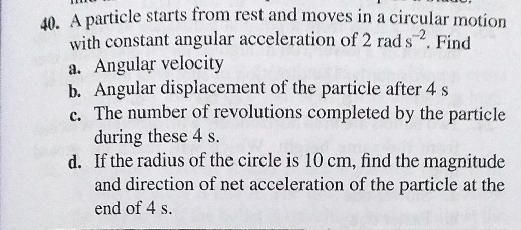 A particle starts from rest and moves in a circular motion with constant angular acceleration of 2 rad/s^2. Find a. Angular velocity b. Angular displacement of the particle after 4 s. A particle starts from rest and moves in a circular motion with constant angular acceleration of 2 rad/s^2. Find a. Angular velocity b. Angular displacement of the particle after 4 s. September 22, 2020 Category: Uncategorised (JEE Advanced Physics by BM Sharma + GMP Solutions) , Facebook Messenger WhatsApp Share this:TwitterFacebook Related