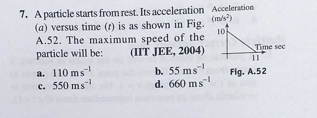 A particle starts from rest. Its acceleration (a) versus time (t) is as shown in Fig. A.52. The maximum speed of the particle will be: A particle starts from rest. Its acceleration (a) versus time (t) is as shown in Fig. A.52. The maximum speed of the particle will be: September 25, 2020 Category: Uncategorised (JEE Advanced Physics by BM Sharma + GMP Solutions) , Facebook Messenger WhatsApp Share this:TwitterFacebook Related