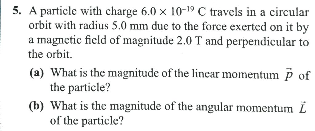 A particle with charge 6.40 × 10^−19 C travels in a circular orbit with radius 4.68 mm due to the force exerted on it by a magnetic field of magnitude 1.65 T and perpendicular to the orbit. a. What is the magnitude of the linear momentum P of the particle? b. What is the magnitude of the angular momentum L of the particle?