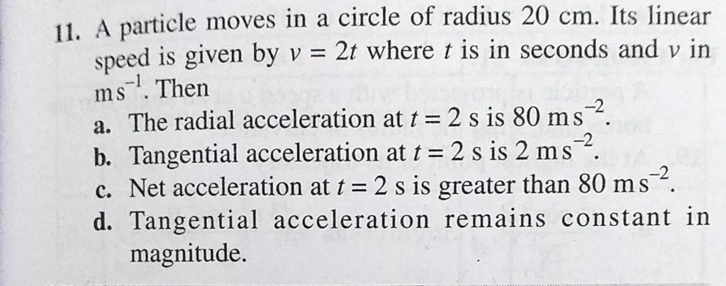 A particles moves in a circle of radius 20 cm. Its linear speed is given by v = 2t where t is in seconds and v in m/s. Then a. The radial acceleration at t = 2 s is 80 m/s^2. b. Tangential acceleration at t = 2 s is All the particles thrown with same initial velocity would strike the ground. a. with same speed b. simultaneously c. time would be least for the particle thrown with velocity v downward i.e. particle 1 September 24, 2020 Category: Uncategorised (JEE Advanced Physics by BM Sharma + GMP Solutions) , Facebook Messenger WhatsApp Share this:TwitterFacebook Related