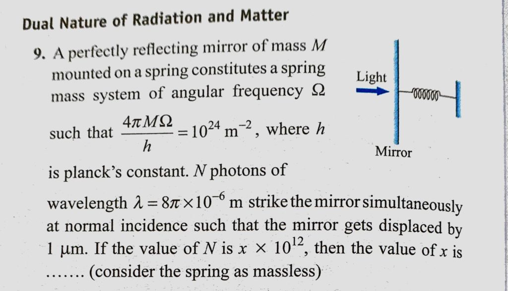 A perfectly reflecting mirror of mass M mounted on a spring constitutes a spring mass system of angular frequency ohm such that 4 pie M ohm / h = 10^24 m^-2, where h is Planck’s constant. A perfectly reflecting mirror of mass M mounted on a spring constitutes a spring mass system of angular frequency ohm such that 4 pie M ohm / h = 10^24 m^-2 where h is Planck's constant. October 23, 2020 Category: Uncategorised (JEE Advanced Physics by BM Sharma + GMP Solutions) , Facebook Messenger WhatsApp Share this:TwitterFacebook Related