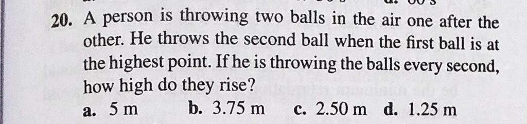 A person is throwing two balls in the air one after the other. He throws the second ball when the first ball is at the highest point. If he is throwing the balls every second, how high do they rise? A person is throwing two balls in the air one after the other. He throws the second ball when the first ball is at the highest point. If he is throwing the balls every second how high do they rise? September 19, 2020 Category: Uncategorised (JEE Advanced Physics by BM Sharma + GMP Solutions) , Facebook Messenger WhatsApp Share this:TwitterFacebook Related