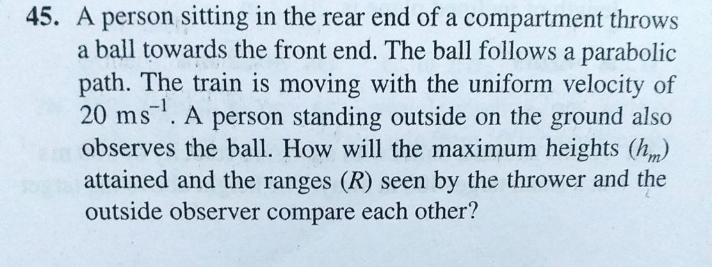 A person sitting in the rear end of a compartment throws a ball towards the front end. The ball follows a parabolic path. The train is moving with the uniform velocity fo 20 m/s. A person standing A person sitting in the rear end of a compartment throws a ball towards the front end. The ball follows a parabolic path. The train is moving with the uniform velocity fo 20 m/s. A person standing September 22, 2020 Category: Uncategorised (JEE Advanced Physics by BM Sharma + GMP Solutions) , Facebook Messenger WhatsApp Share this:TwitterFacebook Related