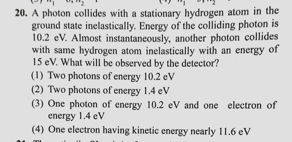 A photon collides with a stationary hydrogen atom in the ground state inelastically. Energy of the colliding photon is 10.2 eV. Almost instantaneously, another photon collides with same hydrogen A photon collides with a stationary hydrogen atom in the ground state inelastically. Energy of the colliding photon is 10.2 eV. Almost instantaneously another photon collides with same hydrogen October 15, 2020 Category: Uncategorised (JEE Advanced Physics by BM Sharma + GMP Solutions) , Facebook Messenger WhatsApp Share this:TwitterFacebook Related