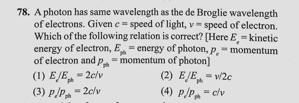A photon has same wavelength as the de Broglie wavelength of electrons. Given c = speed of light, v = speed of electron. Which of the following relation is correct? A photon has same wavelength as the de Broglie wavelength of electrons. Given c = speed of light v = speed of electron. Which of the following relation is correct? October 14, 2020 Category: Uncategorised (JEE Advanced Physics by BM Sharma + GMP Solutions) , Facebook Messenger WhatsApp Share this:TwitterFacebook Related