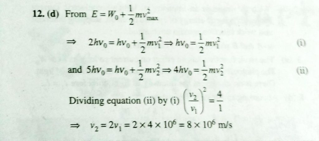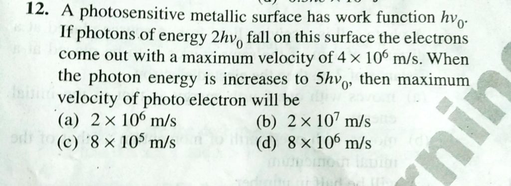 A photosensitive metallic surfaces has work function hv0 . If photon of 2 hv0 fall on the surface ,the electrons come out with a maxiumum velocity of 4×106m/s . If energy of photon is increased to 5 hv0 , the maximum velocity of photo electrons will be :