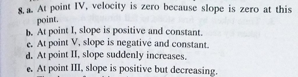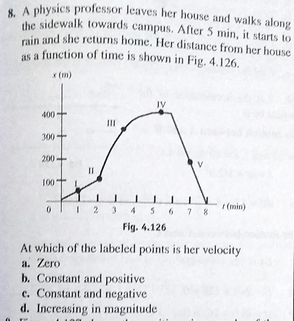 A physics professor leaves her house and walks along the sidewalk towards campus. After 5 min, it starts to rain ans she returns home. Her distance from her house as a function of time is shown in Fig. At which of the labeled points is her velocity a. Zero b. Constant and positive