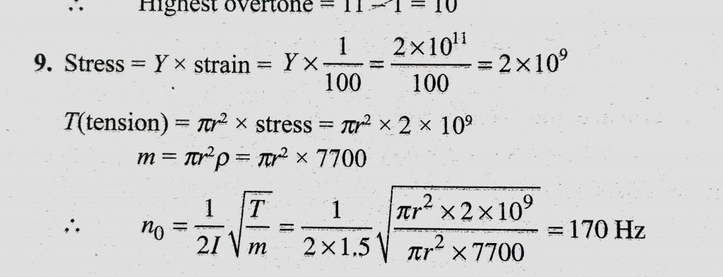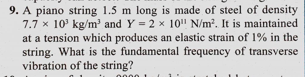 A piano string 1.5 m long is made of steel of density 7.7 * 10^3 kg/m^3 and Y = 2 * 10^11 N/m^2. It is maintained at a tension which produces an elastic strain of 1% in the string. A piano string 1.5 m long is made of steel of density 7.7 * 10^3 kg/m^3 and Y = 2 * 10^11 N/m^2. It is maintained at a tension which produces an elastic strain of 1% in the string. November 5, 2020 Category: Uncategorised (JEE Advanced Physics by BM Sharma + GMP Solutions) , Facebook Messenger WhatsApp Share this:TwitterFacebook Related
