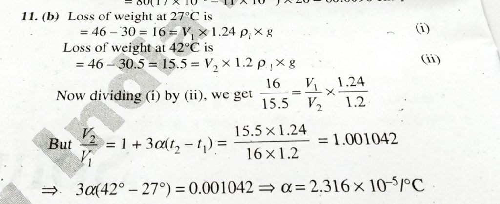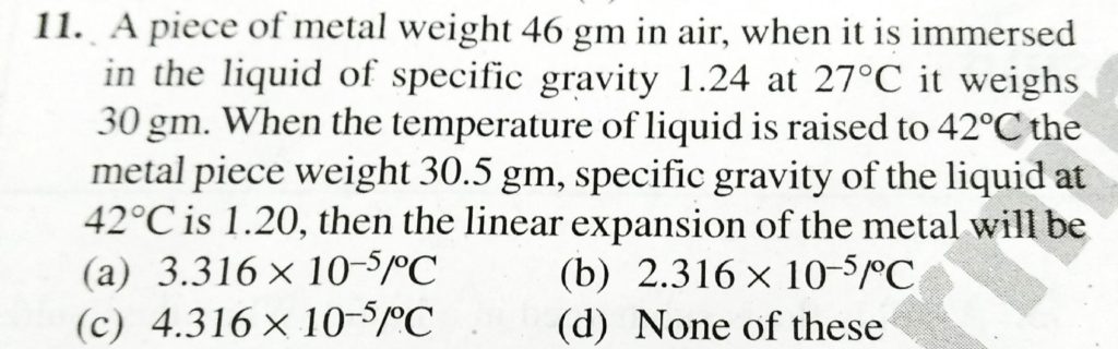 A pices of metal weighs 46 g air. When it is immersed in a liquid of specific gravity 1.24 at 27∘C, it weighs 30g. When the temperature si raised to 42∘C, the metal piece weighs 30.5 g. If the specific gravity of the liquid at 42∘C is 1.20, the coefficient of linear expansion of the metal is