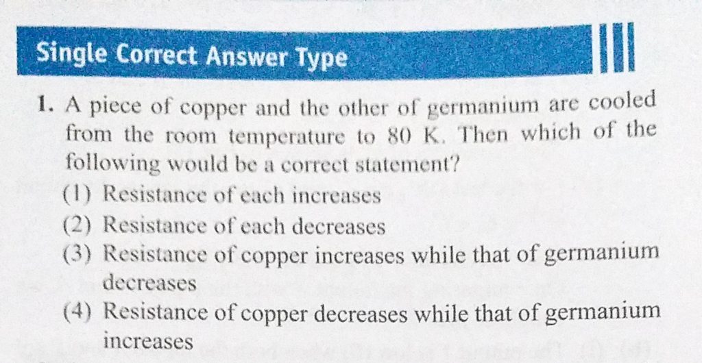A piece of copper and the other of germanium are cooled from the room temperature to 80 K. Then which of the following would be a correct statement ? A piece of copper and the other of germanium are cooled from the room temperature to 80 K. Then which of the following would be a correct statement ? October 21, 2020 Category: Uncategorised (JEE Advanced Physics by BM Sharma + GMP Solutions) , Facebook Messenger WhatsApp Share this:TwitterFacebook Related